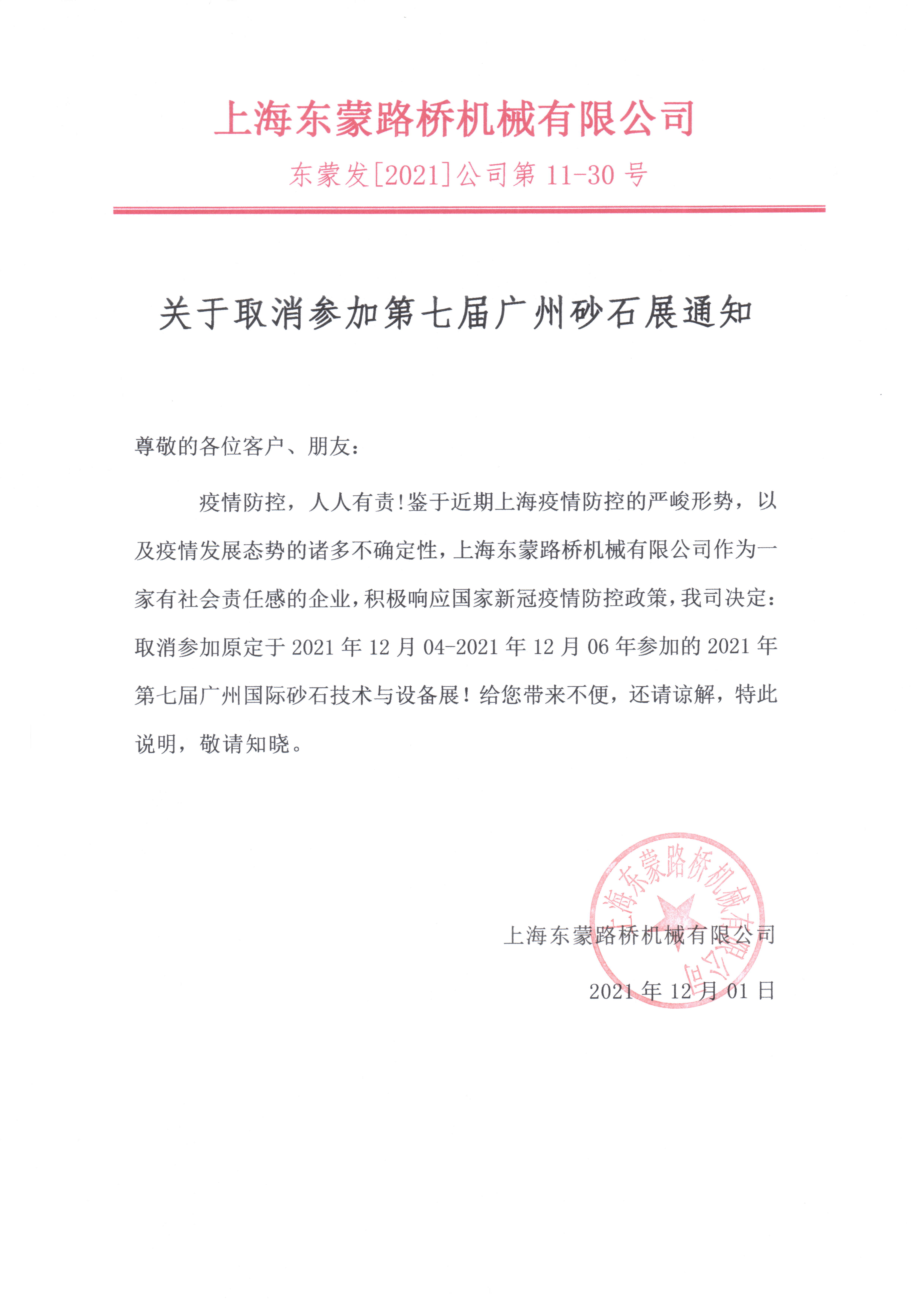 展會取消通知 :為配合疫情防控政策,上海東蒙路橋機械有限公司不參加2021第七屆國際砂石展活動!來日方長我們日后再約!